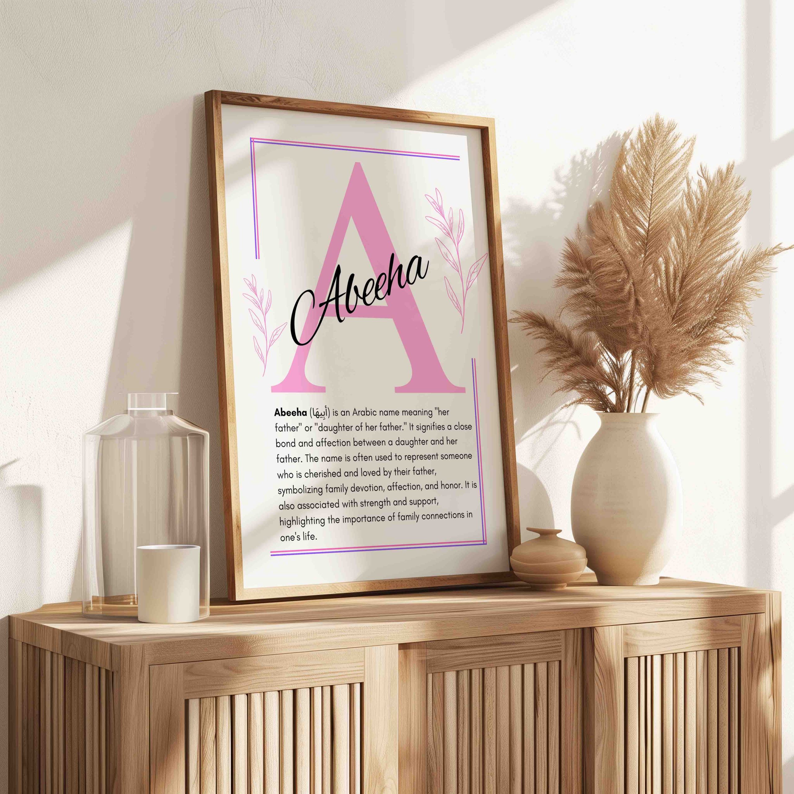 This elegant Islamic digital nursery print features a soft pink design, blending traditional values with modern aesthetics. It’s available as an instant high-resolution digital download in five standard sizes, making it easy to print, frame, and display. Whether for your baby’s nursery, a thoughtful gift, or a keepsake of her name’s meaning, the Abeeha Islamic Name Wall Art adds heartfelt beauty and purpose to any room.