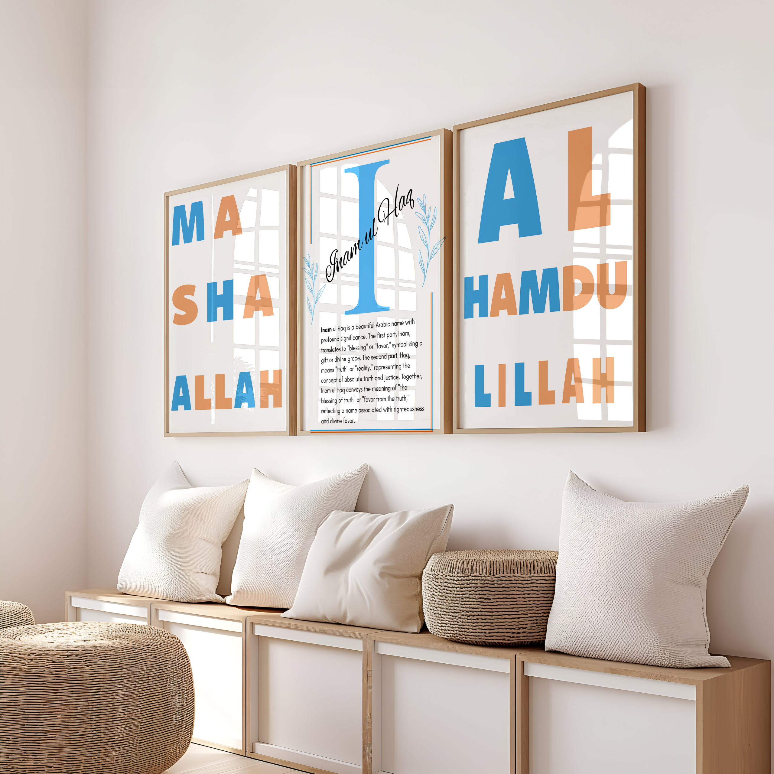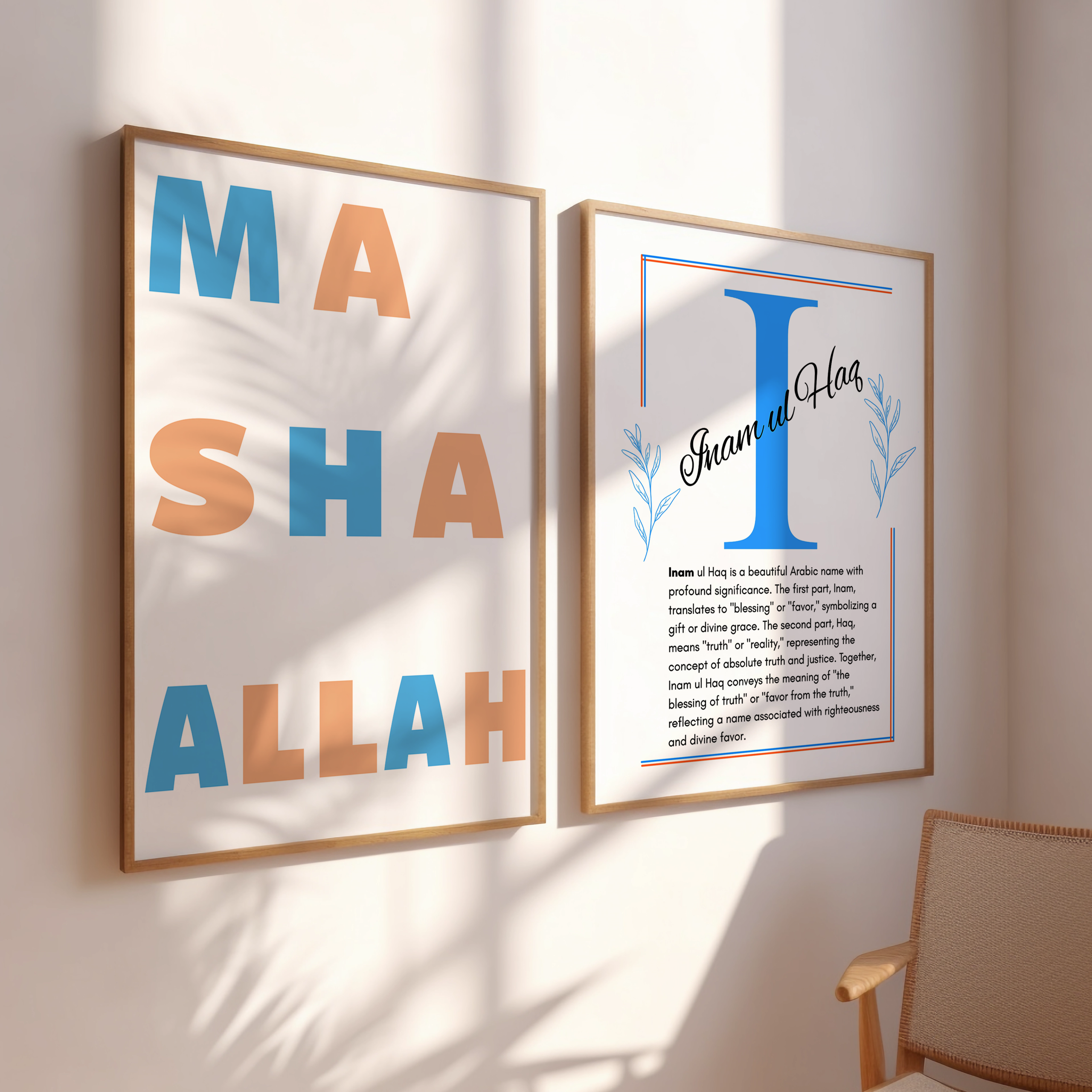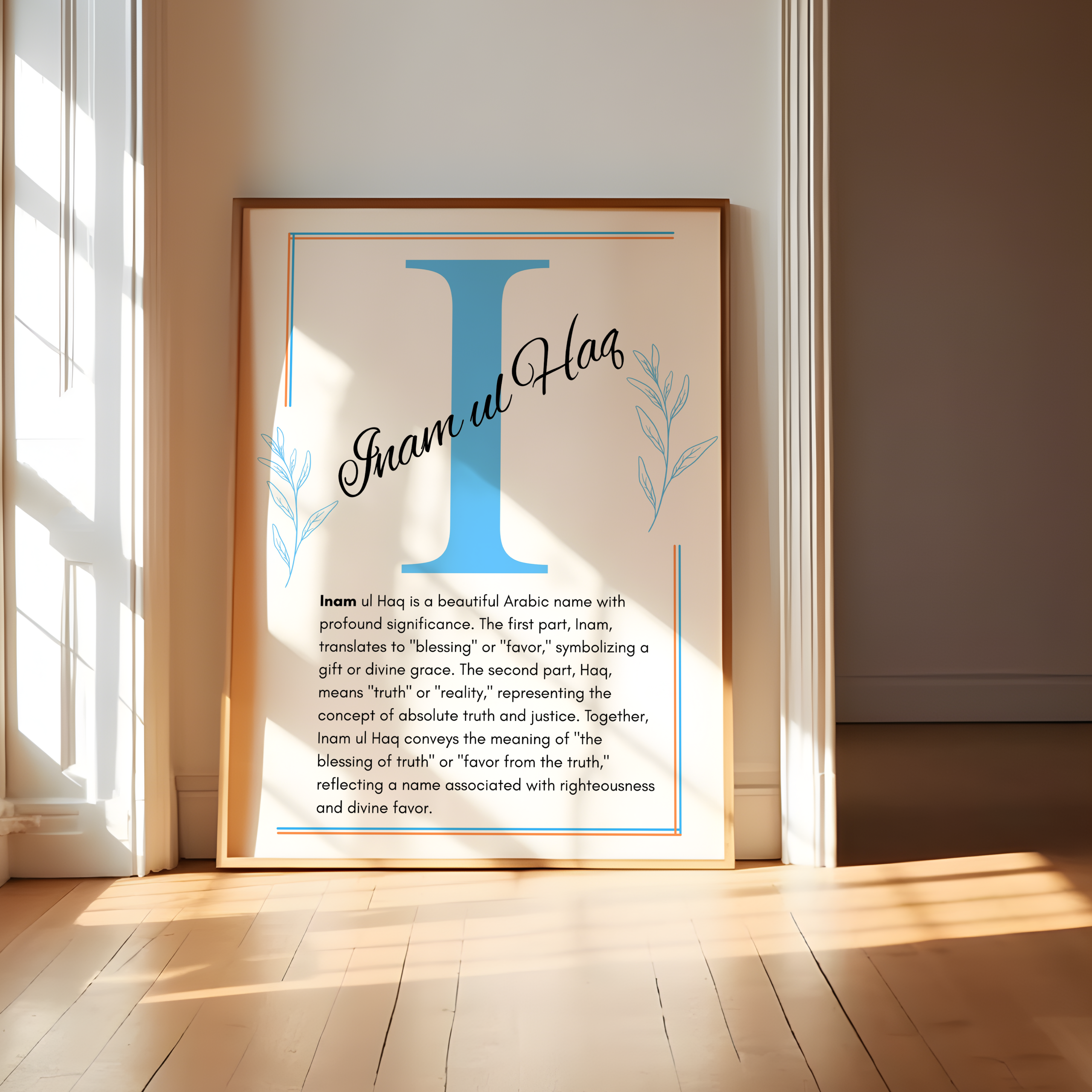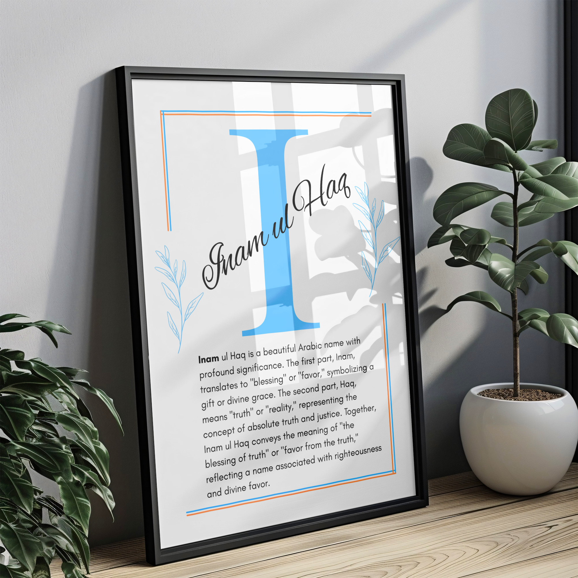 The Inam ul Haq Name Wall Art is a meaningful and inspiring design celebrating the name Inam ul Haq (انعام الحق), which originates from Arabic. The name is composed of two parts: “Inam,” meaning gift, blessing, or reward, and “al-Haq,” one of the beautiful attributes of Allah, meaning “The Truth.” Together, the name carries the profound meaning of “Gift of the Truth” or “Blessing from Allah, the Most Truthful.”