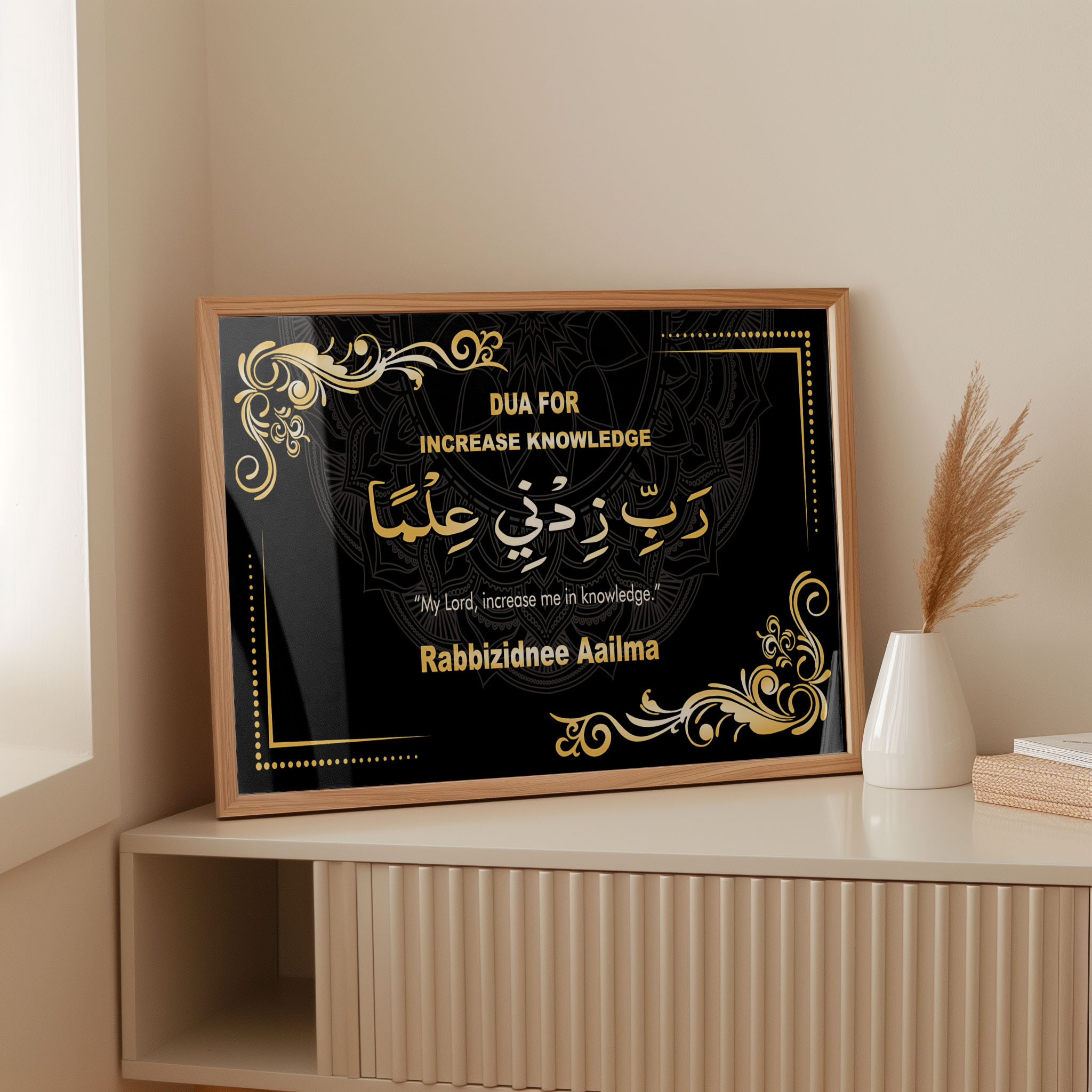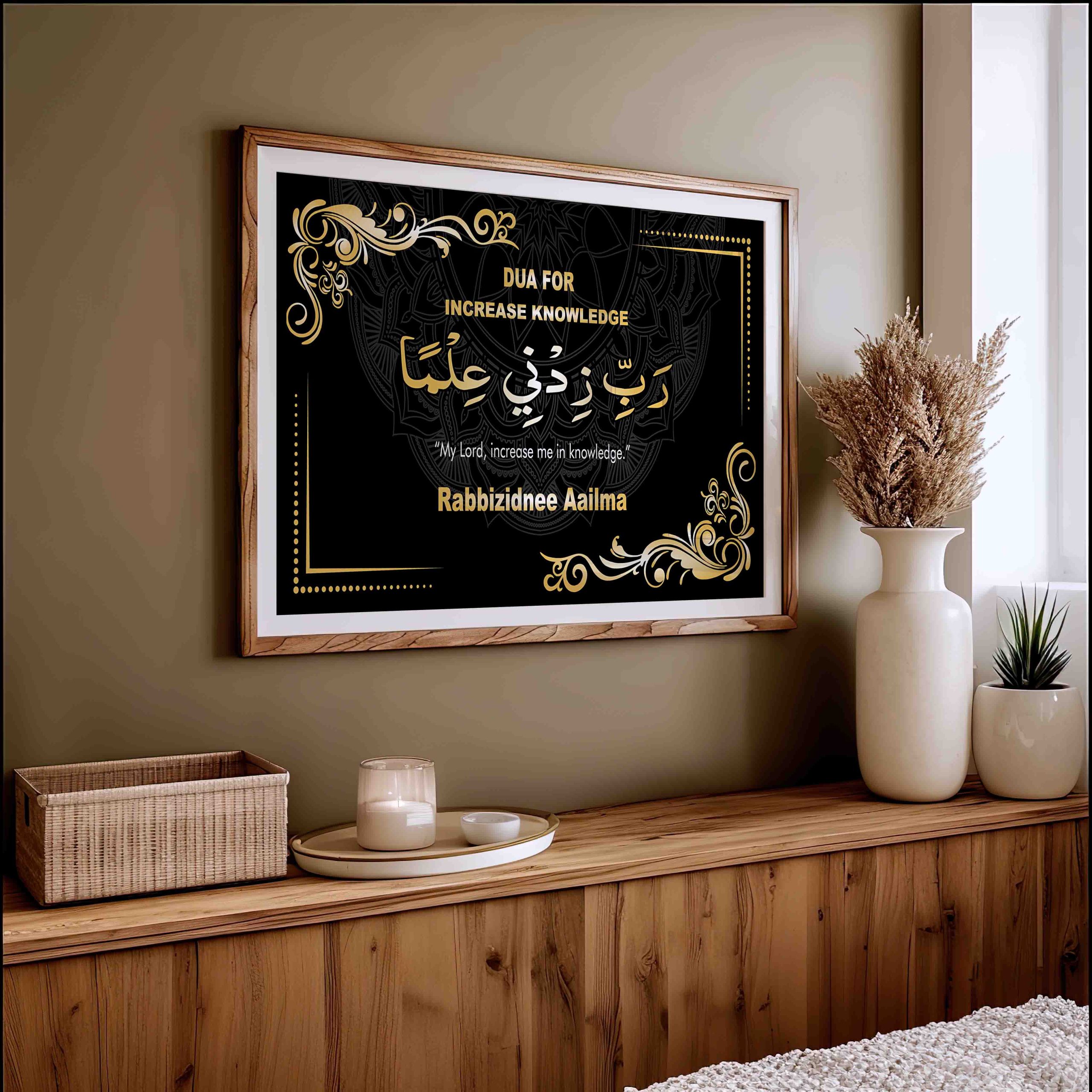 Enhance your home decor with our beautiful Islamic dua wall art, featuring the heartfelt prayer: “My Lord, increase me in knowledge.”